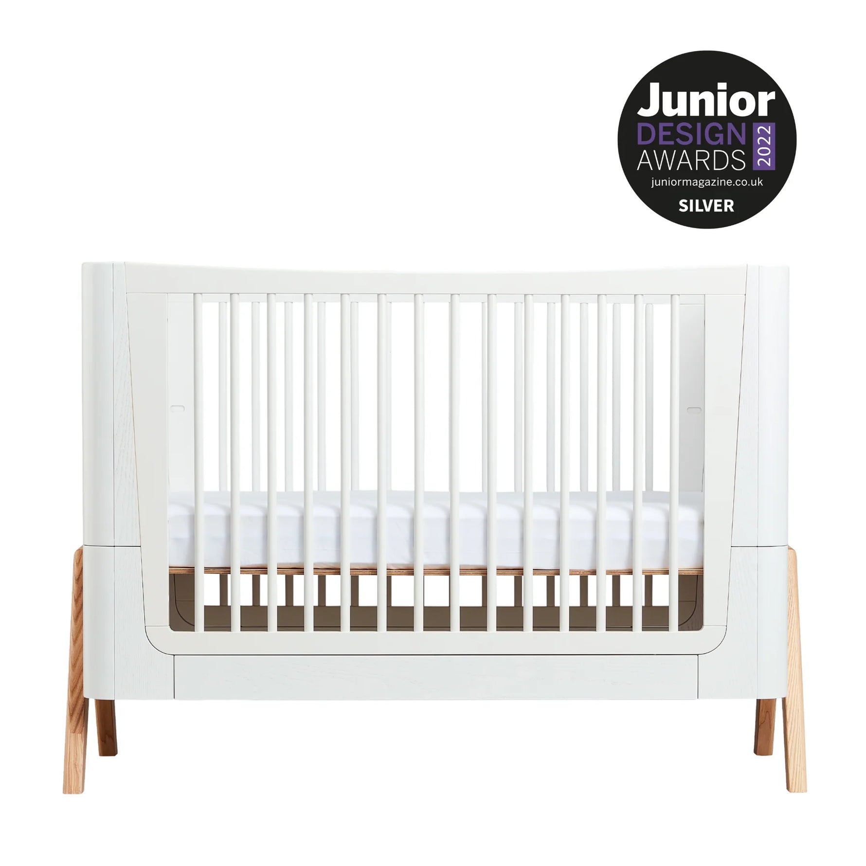 The Hera Cot Bed is a beautiful Mid-Century inspired and cleverly designed choice for your family. Made from 100% real ash wood from sustainably managed ash forests, the gently curved ends in White tones highlight the real grain of this eco-friendly wood with stunning Natural Ash A-frame accents.