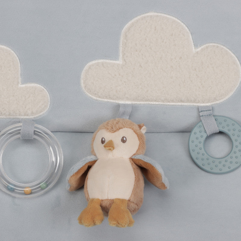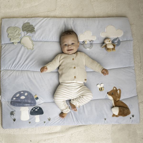 Immerse yourself in the magic of the Forest Friends on this adorable blue play mat. There’s lots to discover and see! Go on an adventure to find the crinkly leave and soft clouds, meet the lovely soft fox, and play with the owl and little beetle. There’s also a small mirror for self-exploration and a transparent ring with three little beads that rattle when they move. This padded playpen mat playfully stimulates your child's senses with its different textures and activities.