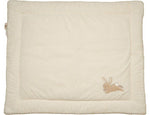Exploring together. A nice playpen mat belongs in a nice playpen. The playpen rugs by Little Dutch are firmly stuffed so your child can lie, play or crawl on them comfortably. The high-quality fabric and finish give it a luxurious look. This reversible playpen mat from the Baby Bunny collection has on one side a beautiful white colour with a sweet bunny and on the other side a beige colour with the text 'Little Moments'.