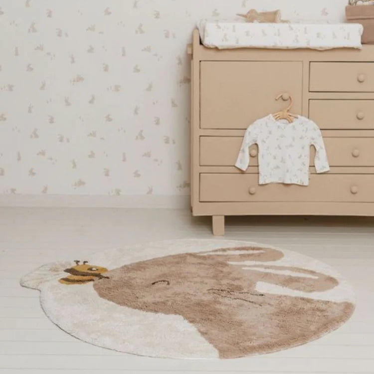 Add warmth to the nursery with a rug from Little Dutch! This rug in the shape of a cute rabbit has a neutral beige shade and is has a bee on its nose. The rug adds a playful and cosy atmosphere to the room. Made of 100% organic cotton and featuring a non-slip latex backing, the rug can be easily cleaned in both the washing machine and dryer. Thanks to the heavier quality cotton, it has a luxurious look, and its attractive price makes it a perfect choice for any interior.