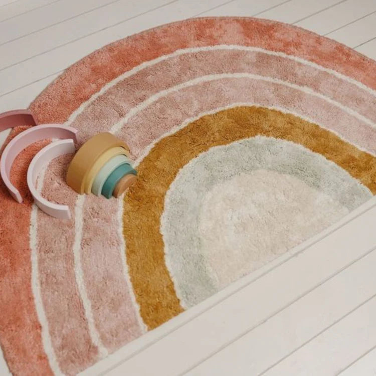 Add warmth to the nursery with a rug from Little Dutch! This rainbow-shaped rug has a basic colour in warm shades, pink, ochre yellow and beige. The rug creates a cosy and playful atmosphere in the room. Made of 100% organic cotton and featuring a non-slip latex backing, it is easy to clean in both the washing machine and dryer. Thanks to the heavier quality cotton, it has a luxurious look, and its attractive price makes it an excellent choice for any interior.