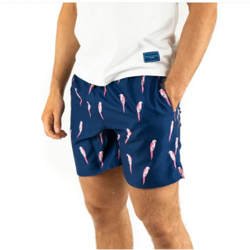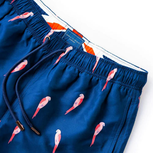 Luxury men's swimwear, the Navy Bold Parrot is a summer essential.