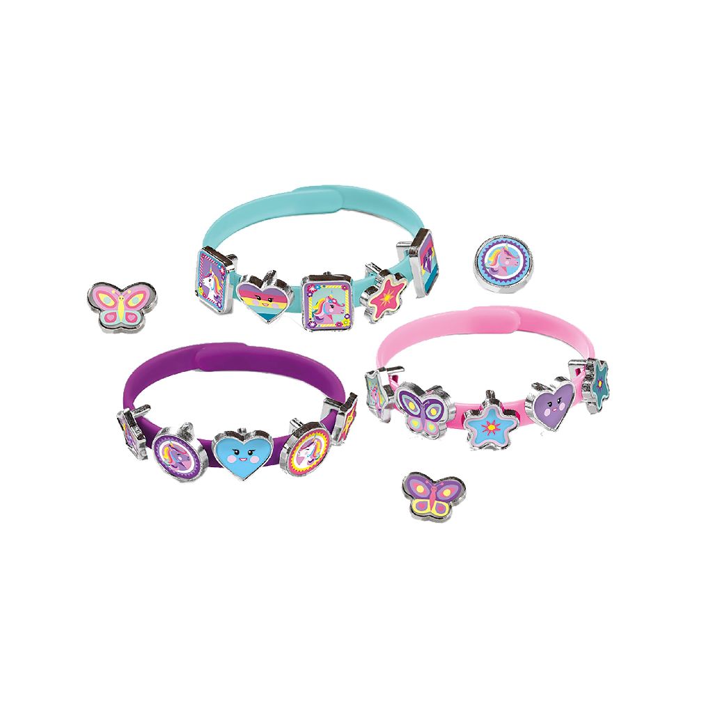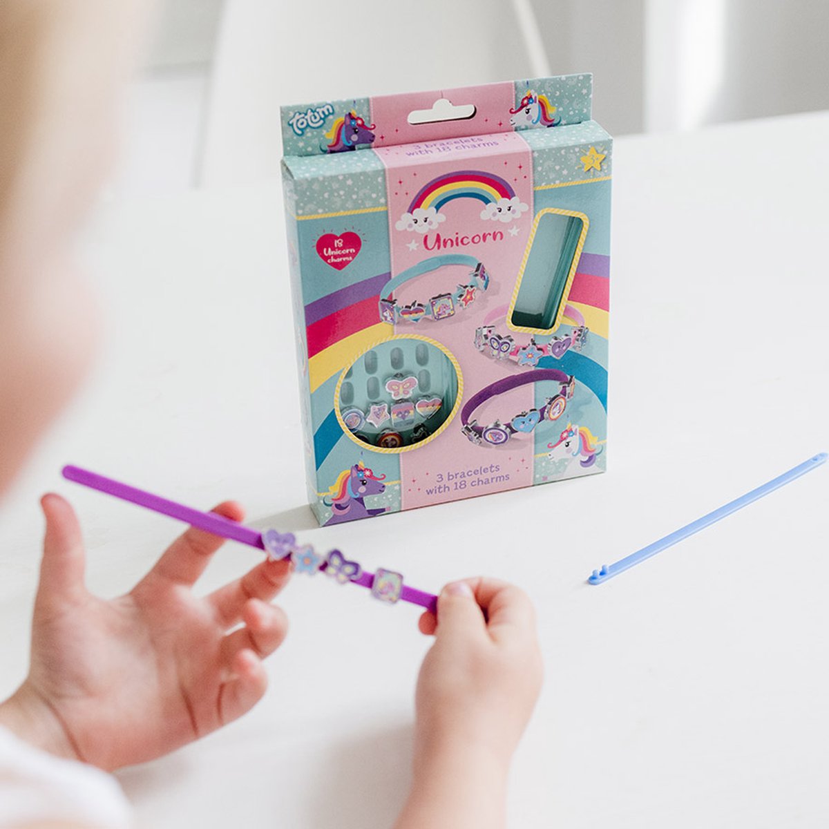 Make your own charm bracelets. This set contains 18 silver charms with images from Unicorns and other magical figures. Slide the charms around the coloured bracelets and mix and match as often as you want.