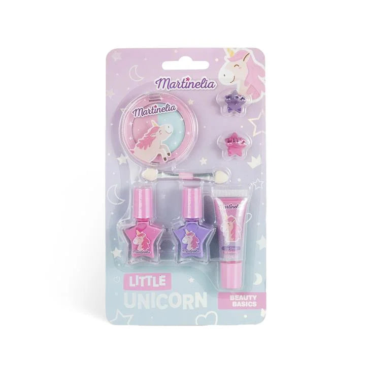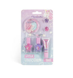 This makeup kit has all the essentials for a beauty session at home. Contains 2 metallic nail polishes, 1 strawberry-flavored lip gloss, 1 eyeshadow palette with 2 colors, 2 star-shaped hair clips and an applicator with her favorite colors!