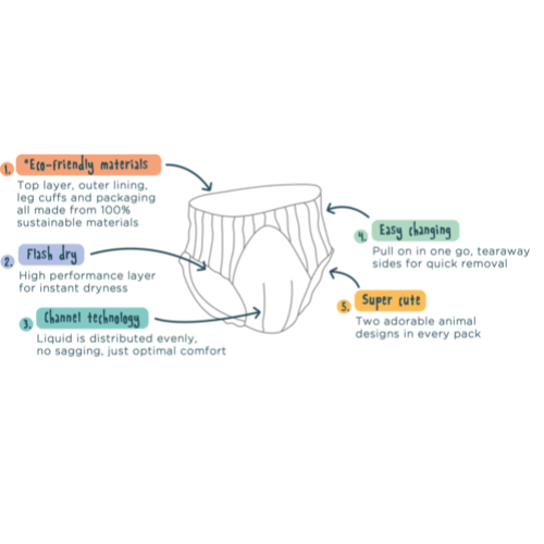 The award-winning hypoallergenic nappy pants with premium performance. If your little one is starting to become more active, it’s time to switch to our nappy pants.