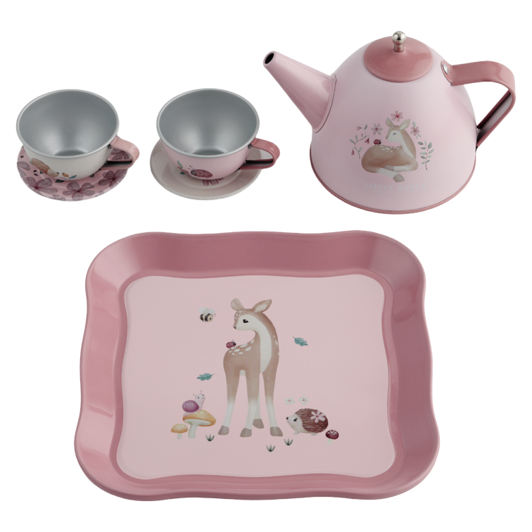 Your little one will organise the cutest tea parties with the Little Dutch Tea Set in the Fairy Garden design. This tin tea set includes two teacups, two saucers, a tray, and a teapot with lid. Put the set in the pretty picnic case and take it with you wherever you go. The case features a colourful rainbow print. Playing with the tea set also stimulates your child’s motor and social skills. Suitable from 3 years of age. Material: metal.
