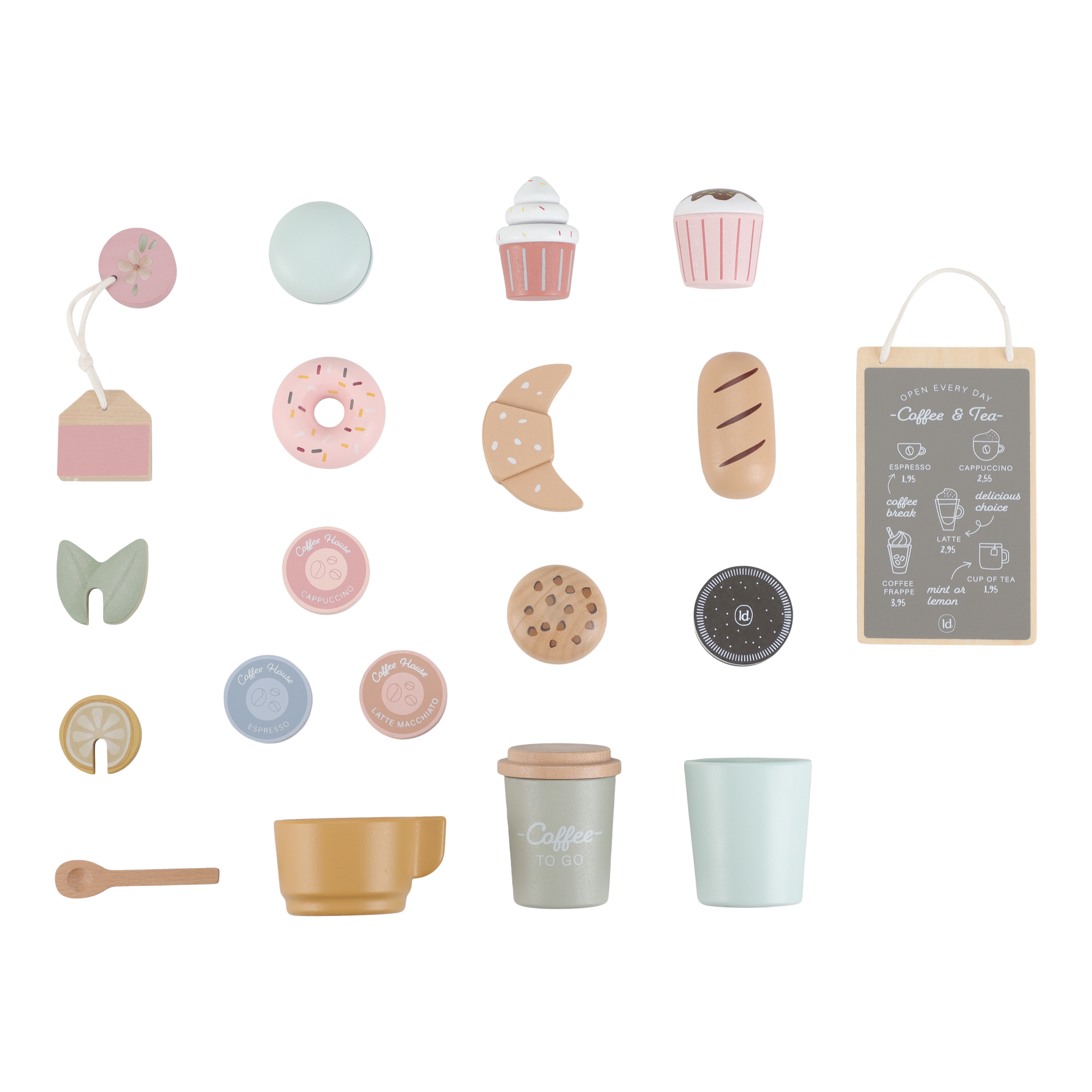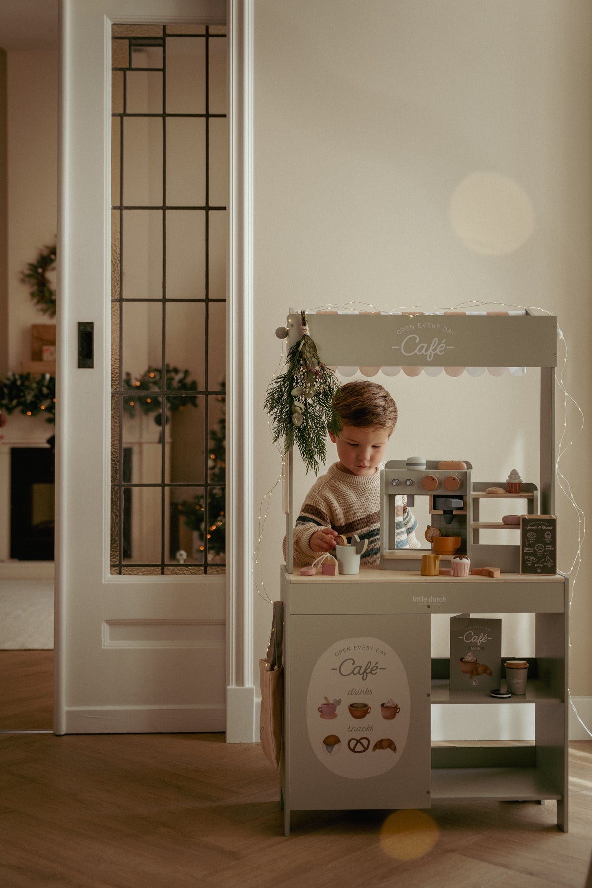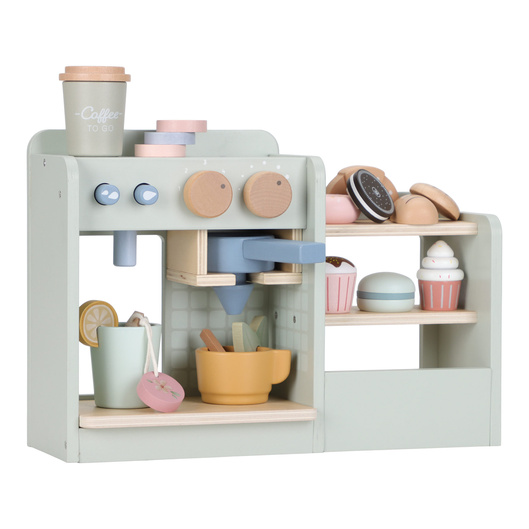Welcome to the coziest coffee corner! Serve a delicious cup of coffee or tea with a fresh sandwich or cake. With this beautiful toy coffee corner, your little one can press buttons, choose the right position and place a coffee pod for a real barista experience. The set includes a coffee and tea maker, a storage space for cups and a cupboard to beautifully display all the delicacies. Who is coming to order something tasty?