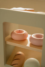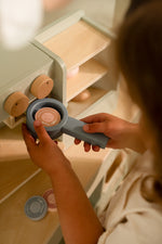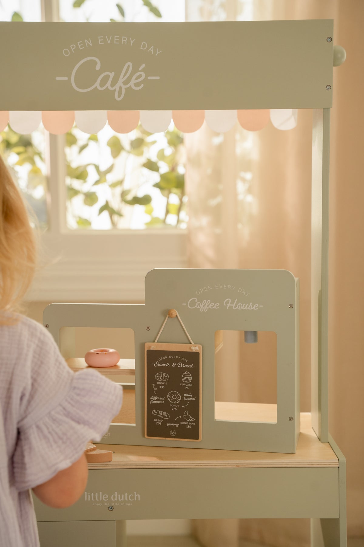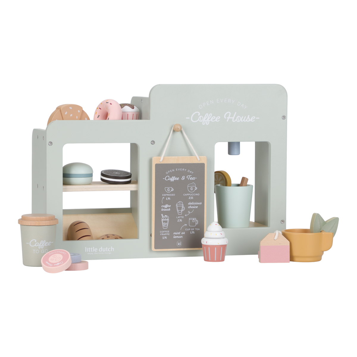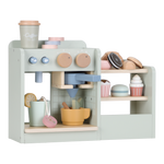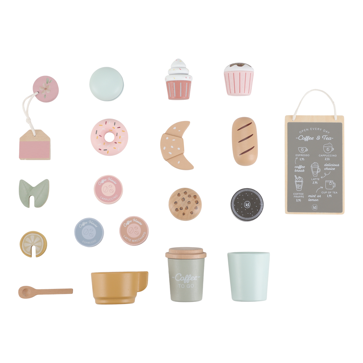 Welcome to the coziest coffee corner! Serve a delicious cup of coffee or tea with a fresh sandwich or cake. With this beautiful toy coffee corner, your little one can press buttons, choose the right position and place a coffee pod for a real barista experience. The set includes a coffee and tea maker, a storage space for cups and a cupboard to beautifully display all the delicacies. Who is coming to order something tasty?