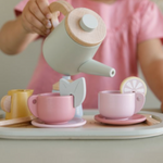 Let's have a cup of tea! With this cute wooden tea set, your little one can serve delicious cups of tea. With milk or sugar, or a slice of lemon or sprig of mint? All ingredients for a perfect tea party with friends.