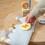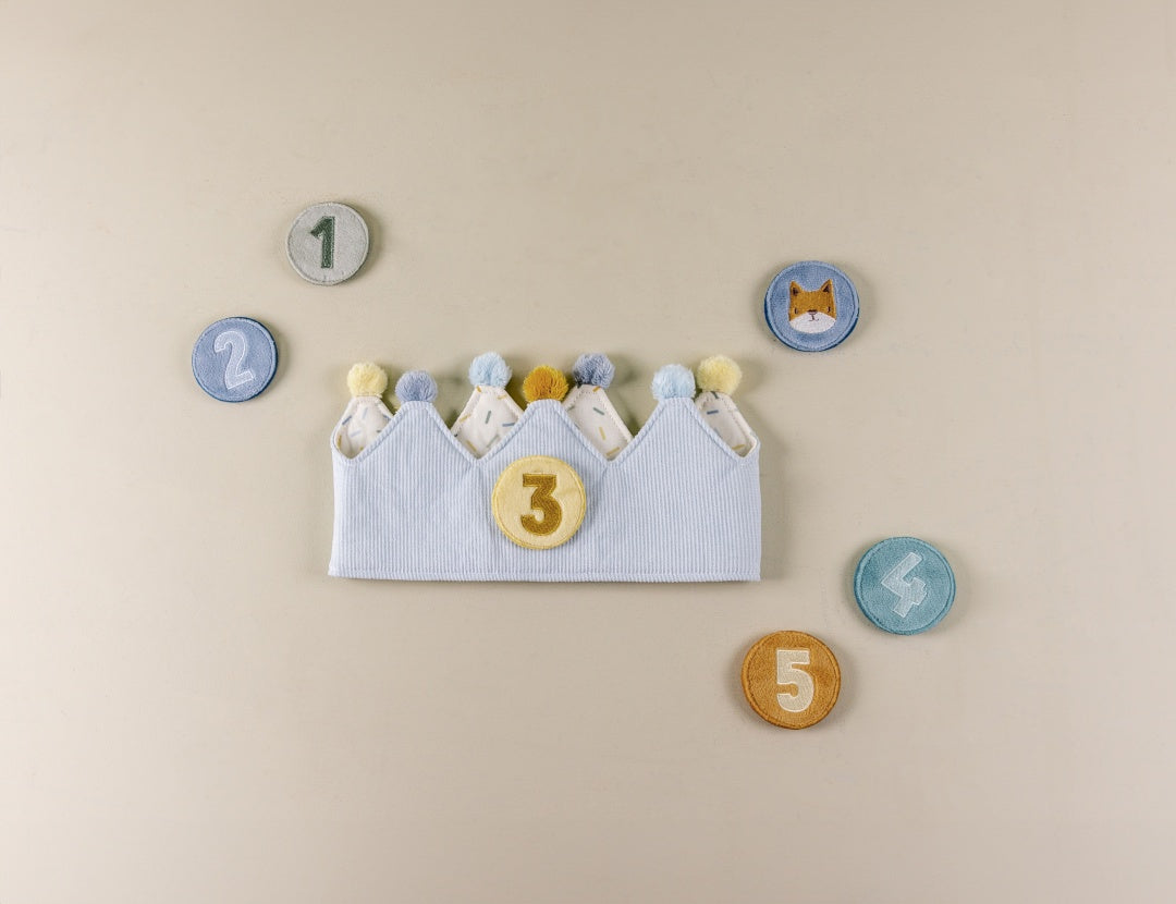 Happy birthday to you! Celebrate in style with this adorable birthday crown and sprinkle some fairy-tale magic on your special day. It comes with interchangeable numbers from 1 to 5, making it perfect for your little one’s growing milestones. Attach the birthday number to the crown and capture those precious moments! Or opt for the fox patch when your little one wants to be the king or queen of everyday wonderland. The crown is made of soft padded and ribbed fabric in light blue topped with coloured pompons. The Velcro closure allows the crown to adapt and grow with your child. Watch your little one proudly wear the crown, showcasing his or her age with every smile and giggle. Happy celebrating!