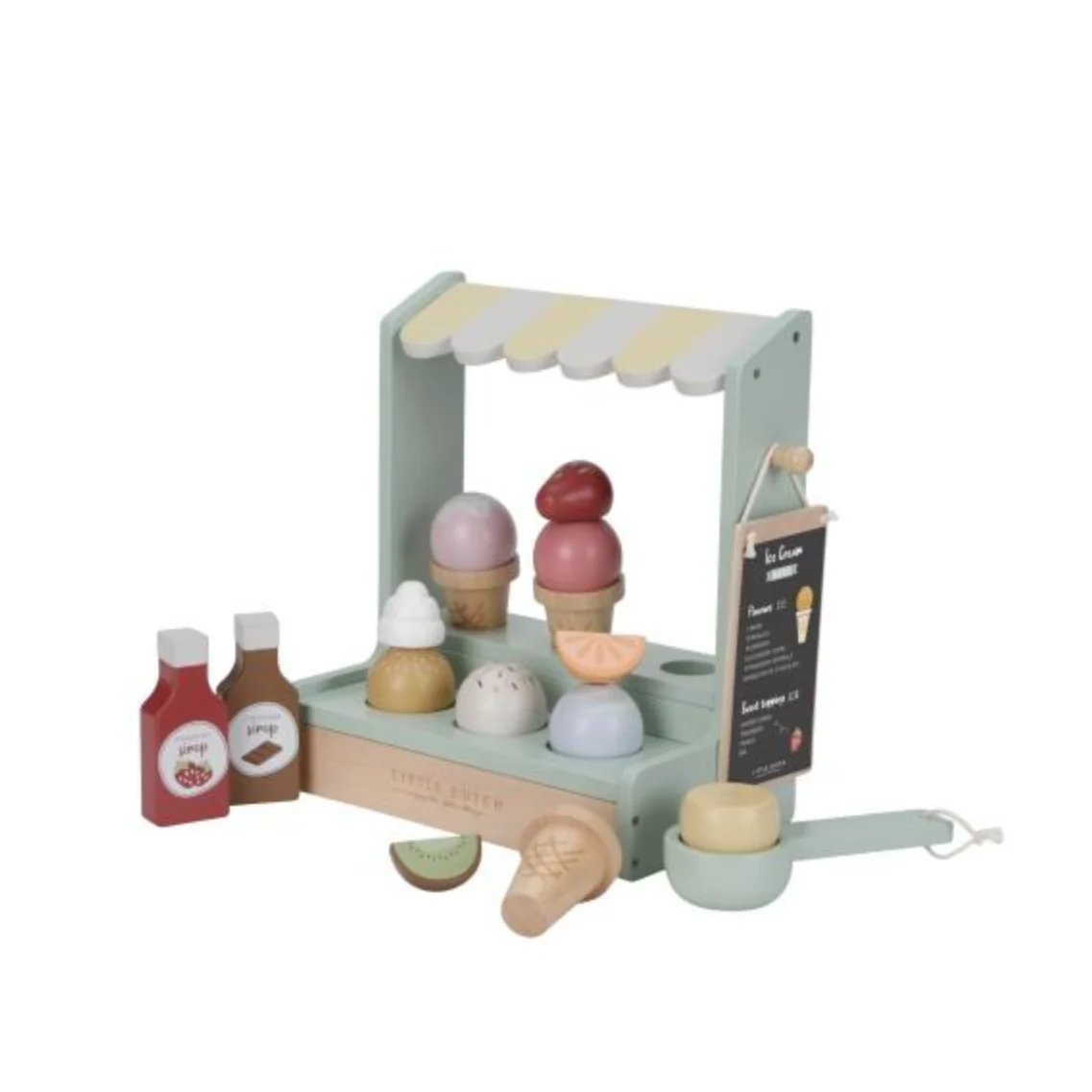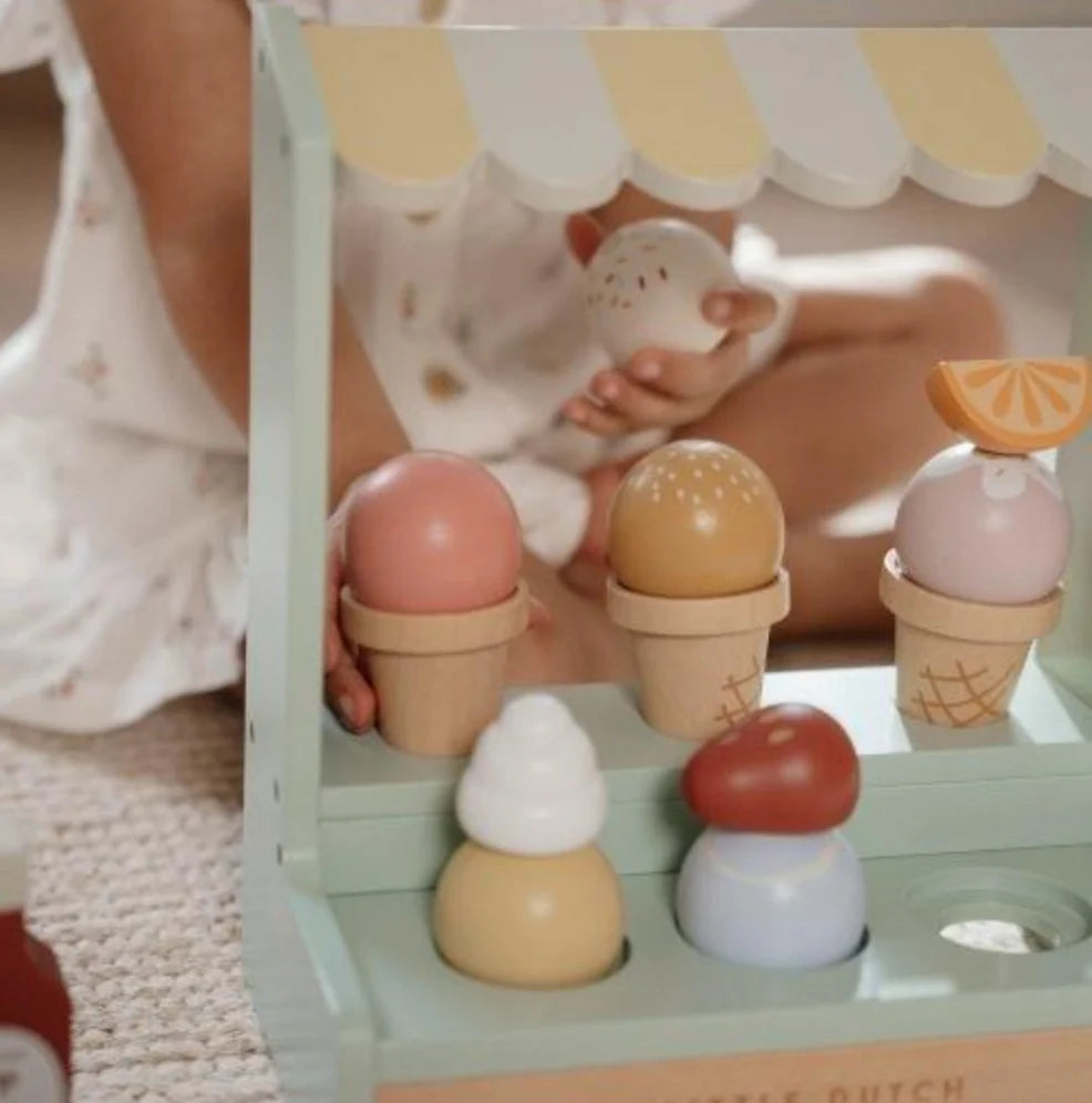 What’s your favourite ice cream flavour? Vanilla or strawberry? This ice cream shop, with its cute yellow and white awning, invites you to try all six of them. There are three cones to fill with the sweetest creations, and you can enhance the fun with a variety of colourful toppings. Let the creative play unfold as your little one explores the joy of running this cute wooden ice cream shop. Whether serving imaginary customers or playing the cashier holding the included price list, this wooden toy is designed to inspire hours of imaginative play.