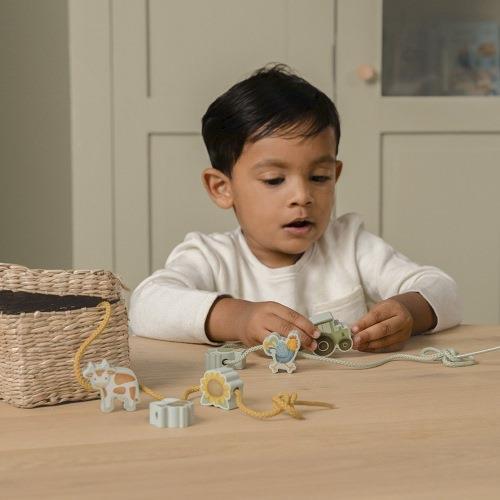 String the beads and create a beautiful farmhouse necklace! What farm story will you tell with your creation? What does the chicken do? Can you help him find the farm? Will he meet his friend the cow along the way? Where does his adventure end? To the tractor? Use your imagination to tell a beautiful story by stringing these pretty beads one by one to form a magnificent necklace. This stringing bead set features a lace and wooden beads featuring the beautiful illustrations from the Little Farm collection. Little ones will love stringing the beads and using their imagination to tell the most vivid stories. Playing with lace beads promotes fine motor skills, hand-eye coordination and creativity.