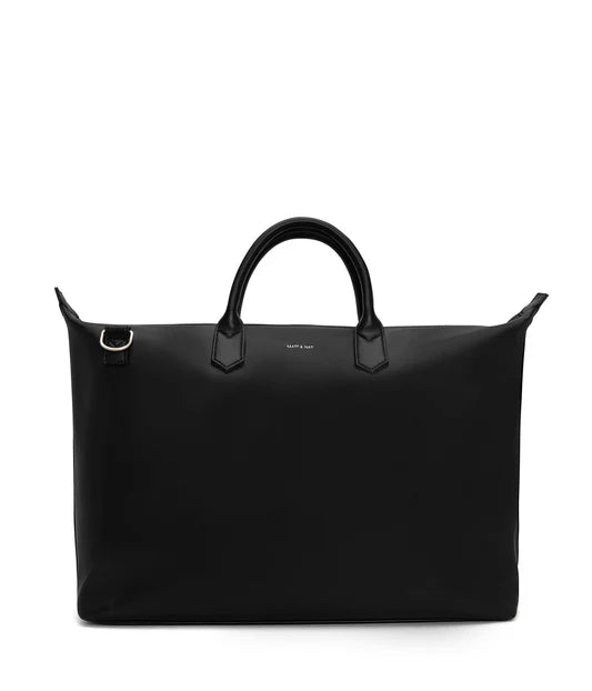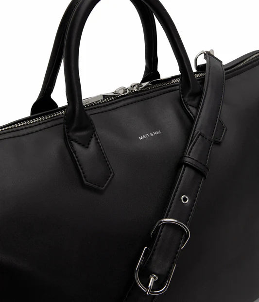 Weekender bag with two-way metal zip closure at top and tab detail at the zipper ends. Comes with a removable and adjustable crossbody strap.