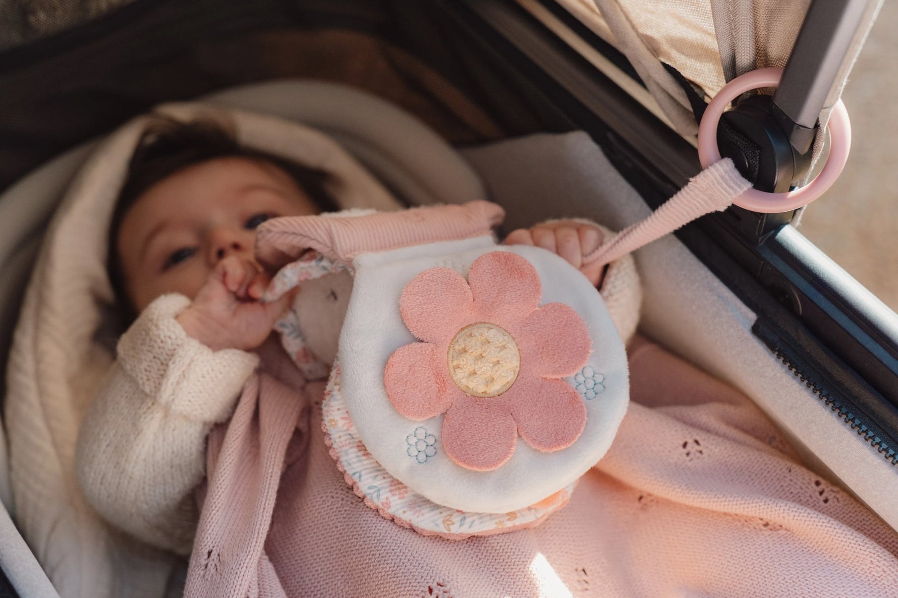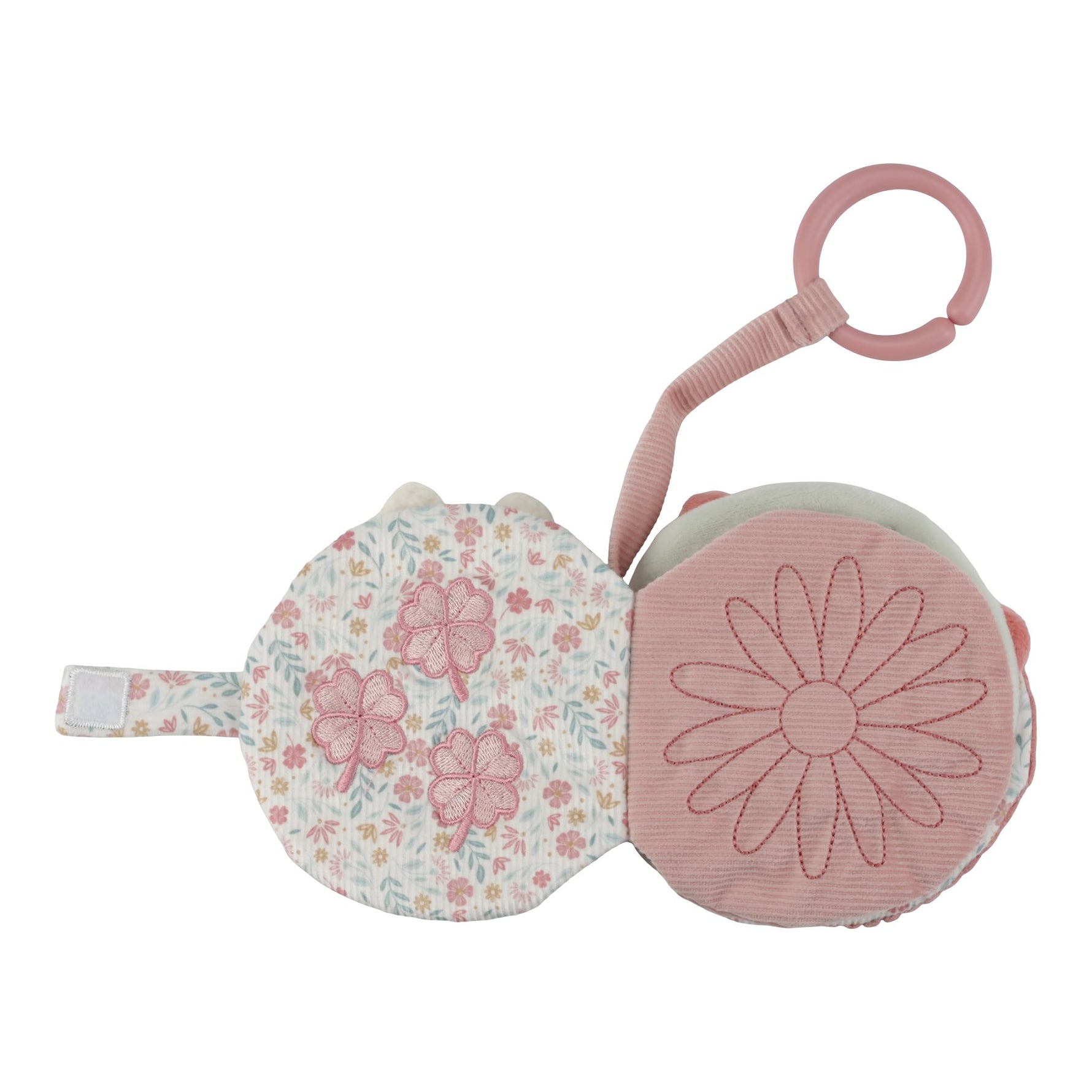 Miffy entertainment on the road! This touch & play buggy booklet in Lucky Blossom theme will undoubtedly be a favorite of your little one. Featuring fun labels, wrinkle textures and sounds, this book will stimulate children's senses. It also has a mirror for self-discovery and a soft Miffy on the front. Attach the toy ring to the stroller for entertainment on the go.