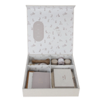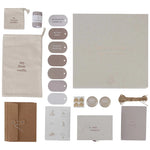 Keep your baby's memories in this luxury linen Little Dutch memory box Newborn Naturals. This memory box offers many ways to preserve memories of important milestones in a personal and creative way. The memory box contains a booklet, tags, jute string, kraft envelopes, sticker sheet, photo corners, tin hair box, tin tooth box, Little Treasures storage box, measuring tape, storage bag for the first outfit and a storage bag for the dummy. How nice to discover together later the many memories and treasures stored together in this beautiful Newborn Naturals box. The front of the memory box features the quote 'Little moments, big memories