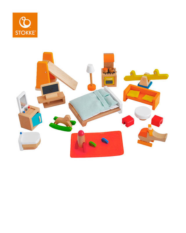 Made of high quality wood, the Stokke MuTable Dollhouse furniture features 28 small pieces of furniture in bright colours to decorate your MuTable Dollhouse.