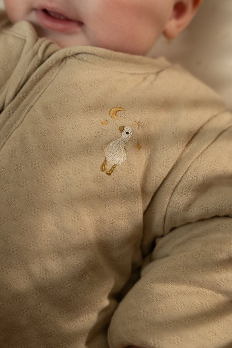 Keep your little one warm and cosy this winter with the Little Dutch winter sleeping bag in the elegant Soft Beige colour. Made of luxurious jersey jacquard fabric and 100% organic cotton, it feels wonderfully soft. The cute goose embroidery on the chest adds a touch of charm, while the round bottom and zip-off sleeves are practical and comfortable. Perfect for cold nights and cute dreamers. There is a flap over the zip to protect baby's sensitive skin. The sleeping bag is available in 70 cm and 90 cm.