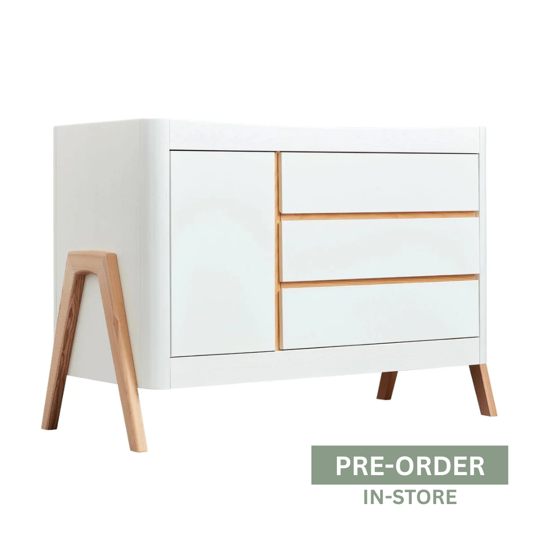 The Hera Dresser is a beautiful Mid-Century inspired and cleverly designed choice for your family. Made from sustainably managed Ash forests, the gently curved ends of this baby dresser in Natural tones highlight the real grain of this eco-friendly wood.