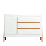 With stunning Walnut, A-frame accents, its' generous size of this nursery dresser makes it suitable for storing all your baby's needs and for use later in a teen or adult space. 3 generous smooth action drawers and a cabinet with 2 height-adjustable shelves, provide ample storage space for clothing, changing essentials and bedding.