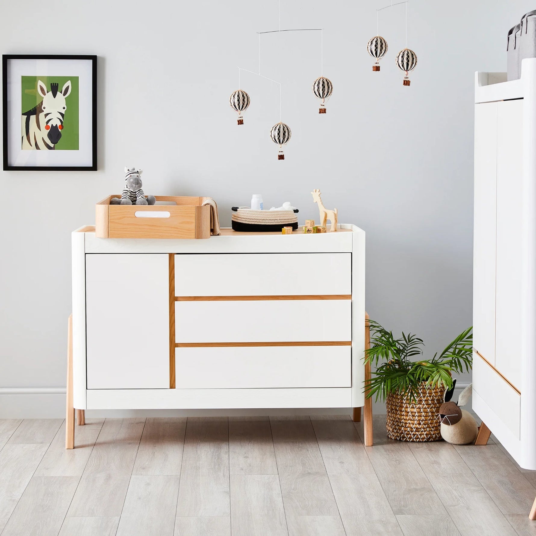 With stunning Natural Ash, A-frame accents, The Hera Dresser's generous size makes it suitable for storing all your baby's needs and for use later in a teen or adult space. 3 generous smooth action drawers and a cabinet with 2 height adjustable shelves, provide ample storage space for clothing, changing essentials and bedding.