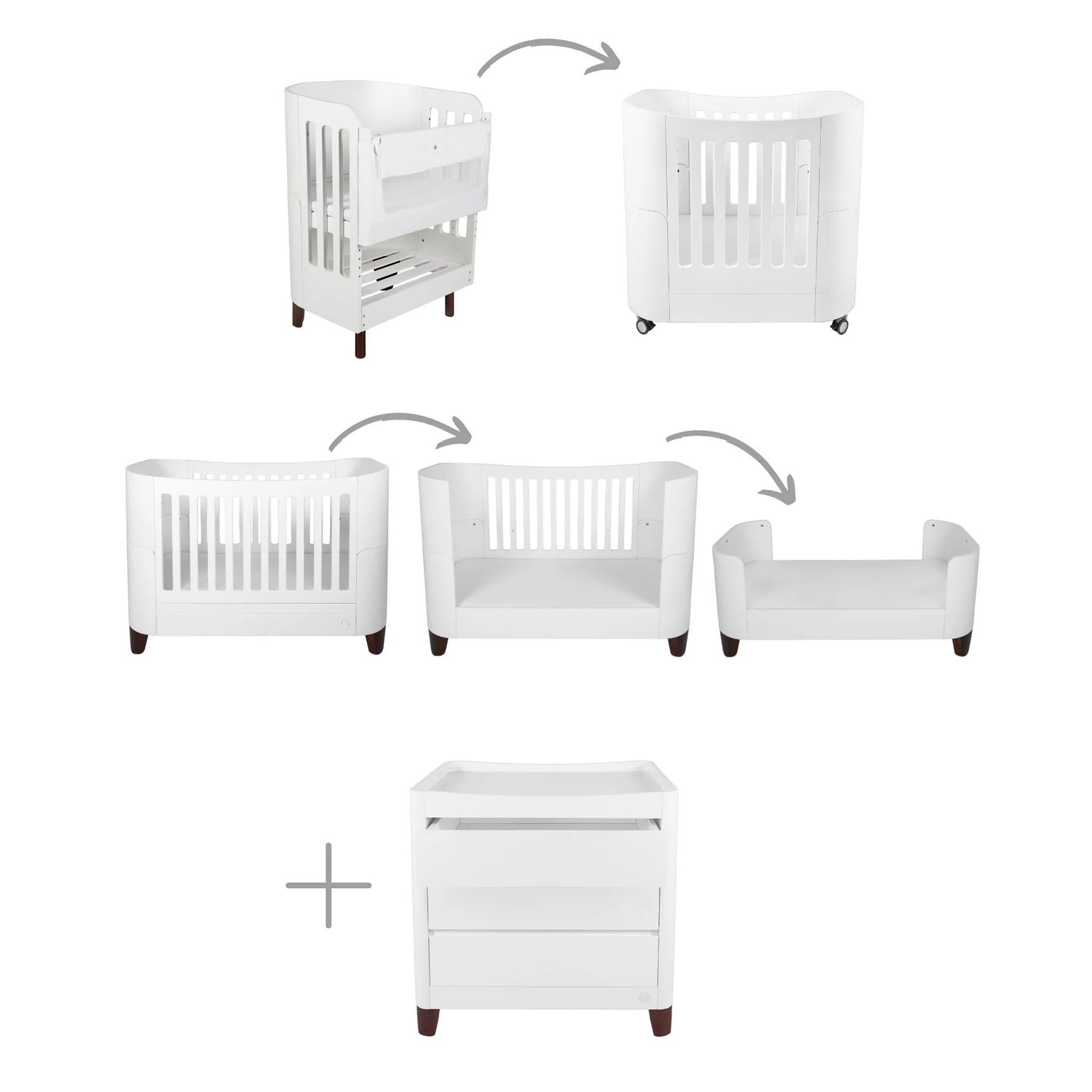The hassle-free all-in-one sleep solution. Take your baby from newborn to 5 years through 5 different configurations. Start your baby's journey in our fully safety-certified Bedside Crib. The Serena Bedside Crib allows baby to sleep safely and securely and within easy reach for night-time feeds and cuddles. Once the baby becomes mobile, convert your crib to a compact and fully mobile Mini Cot with wheels for extended in-room sleeping.