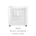 The hassle-free all-in-one sleep solution. Take your baby from newborn to 5 years through 5 different configurations. Start your baby's journey in our fully safety-certified Bedside Crib. The Serena Bedside Crib allows baby to sleep safely and securely and within easy reach for night-time feeds and cuddles. Once the baby becomes mobile, convert your crib to a compact and fully mobile Mini Cot with wheels for extended in-room sleeping.
