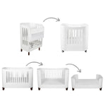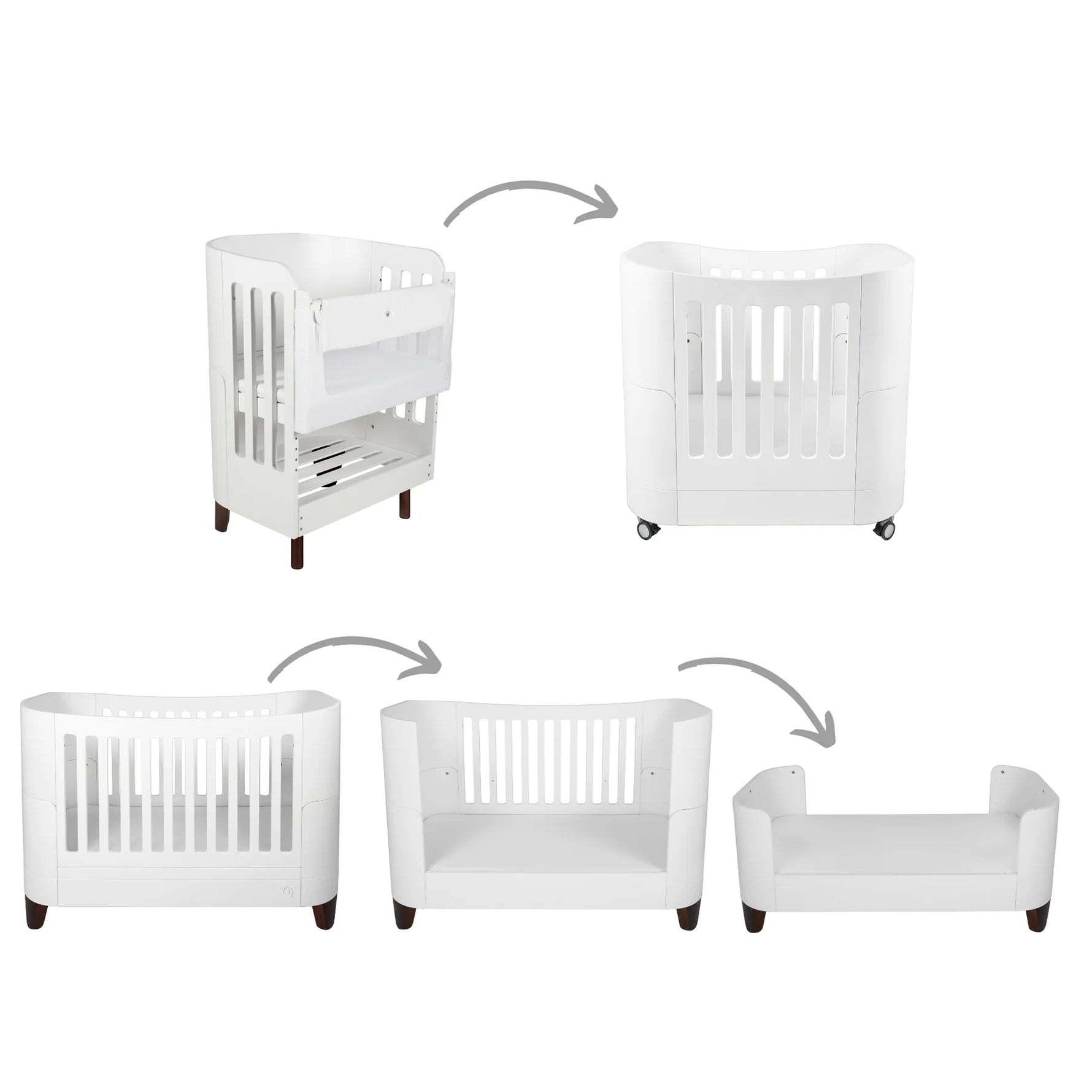 The hassle-free all-in-one sleep solution. Take your baby from newborn to 5 years through 5 different configurations. Start your baby's journey in our fully safety-certified Bedside Crib. The Serena Bedside Crib allows baby to sleep safely and securely and within easy reach for night-time feeds and cuddles. Once the baby becomes mobile, convert your crib to a compact and fully mobile Mini Cot with wheels for extended in-room sleeping.