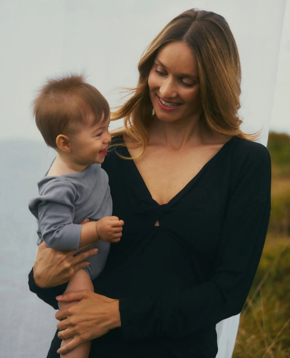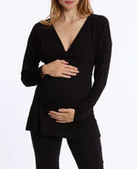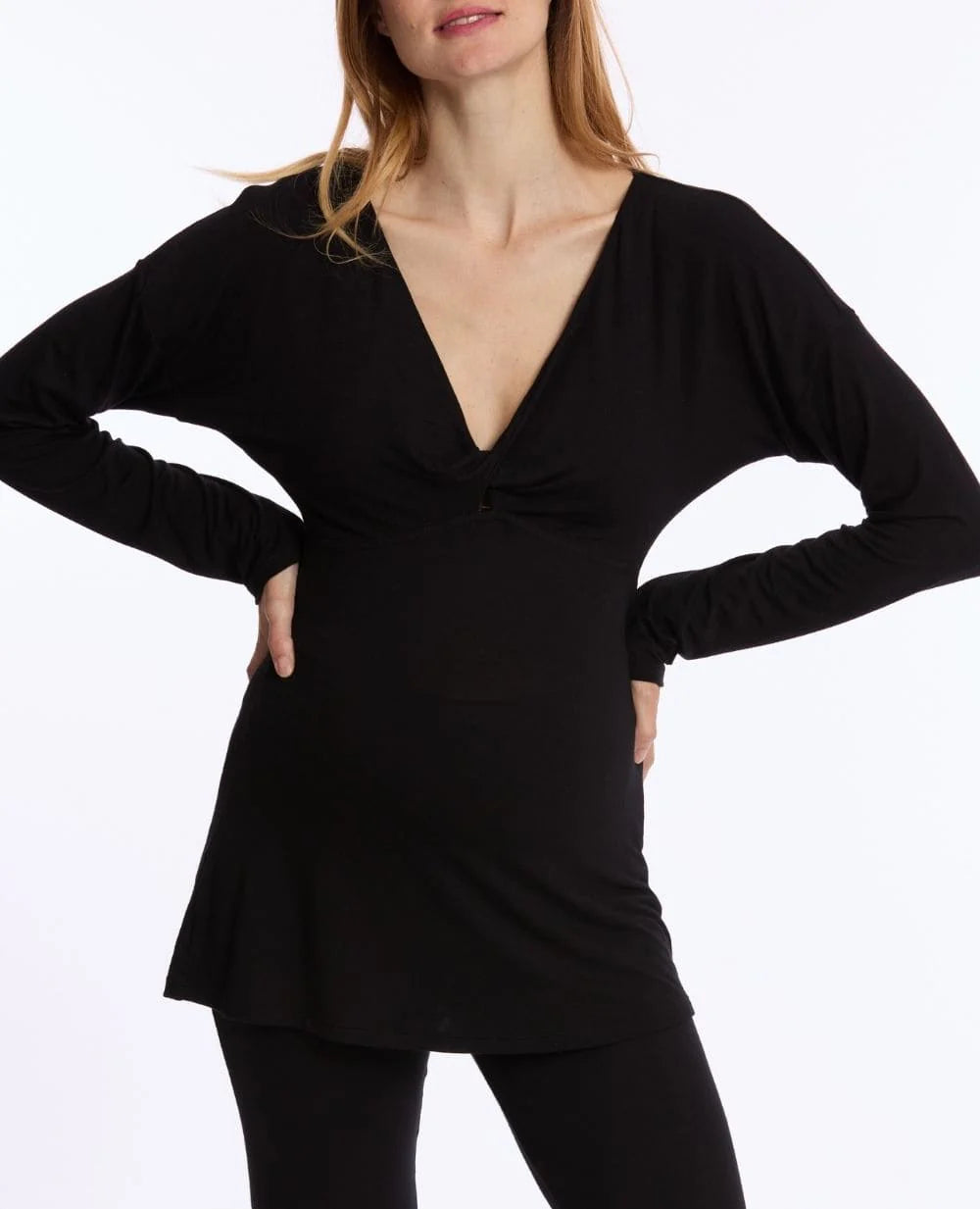 The Louna maternity long sleeve t-shirt is made from bamboo viscose, a light and very soft material. You will love its V-neck with a twisted effect and its long sleeves. A pretty and comfortable piece for night and home wear.