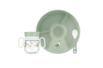 The 3-piece baby dinnerware set consists of the 360° cup, a divider plate, and a training spoon.