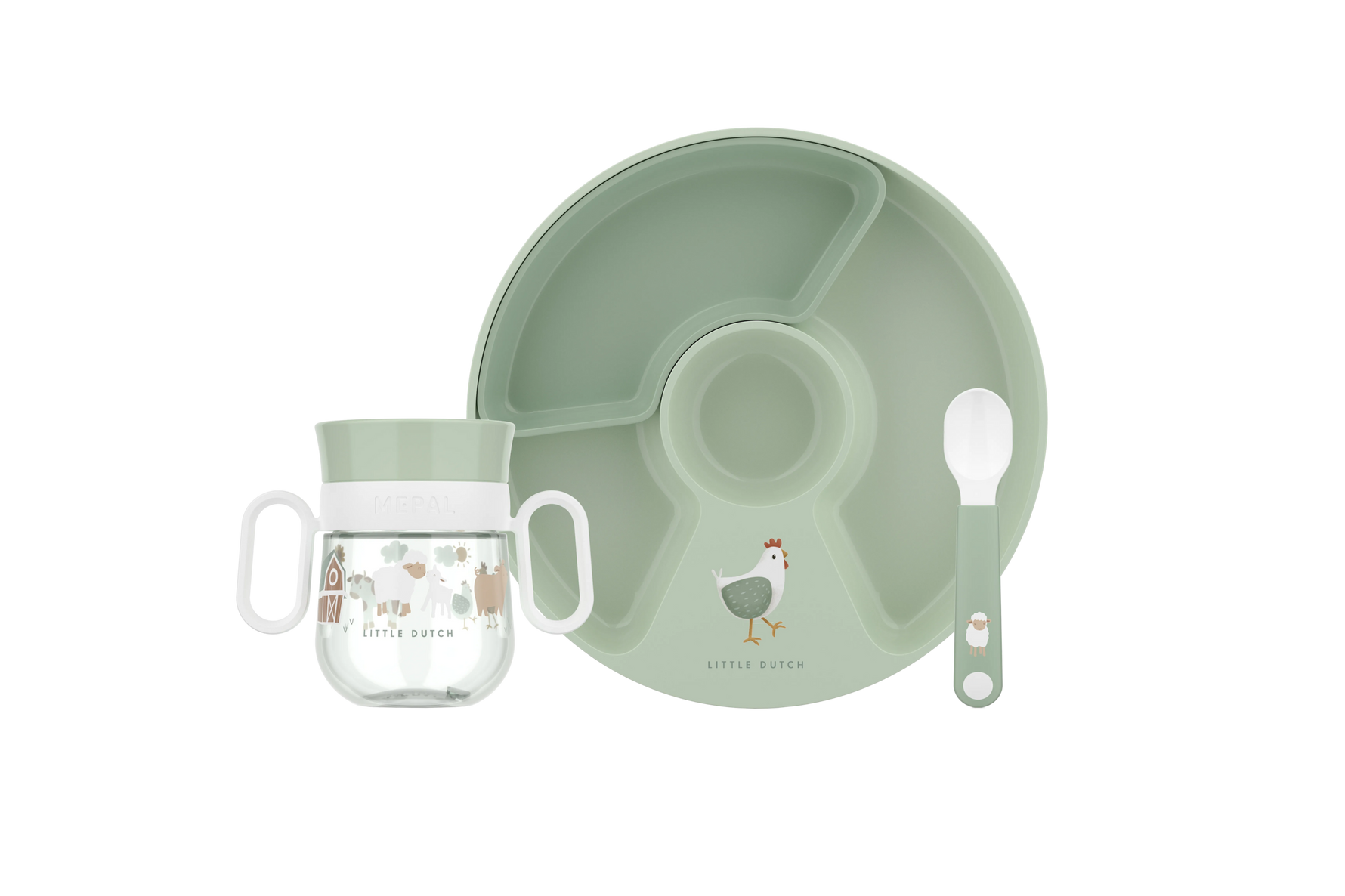 With the Mepal Mio baby set in Little Farm, even the littlest among us can learn to eat and drink by themselves. The set consists of a trainer cup, a divider plate and a feeding spoon. All three can endure rough handling and are nice and lightweight. The cup, plate and spoon are designed so that even small hands can handle them easily. And is everything used? Then it goes straight into the dishwasher. The set comes nicely packaged, which also makes it a great maternity gift.
