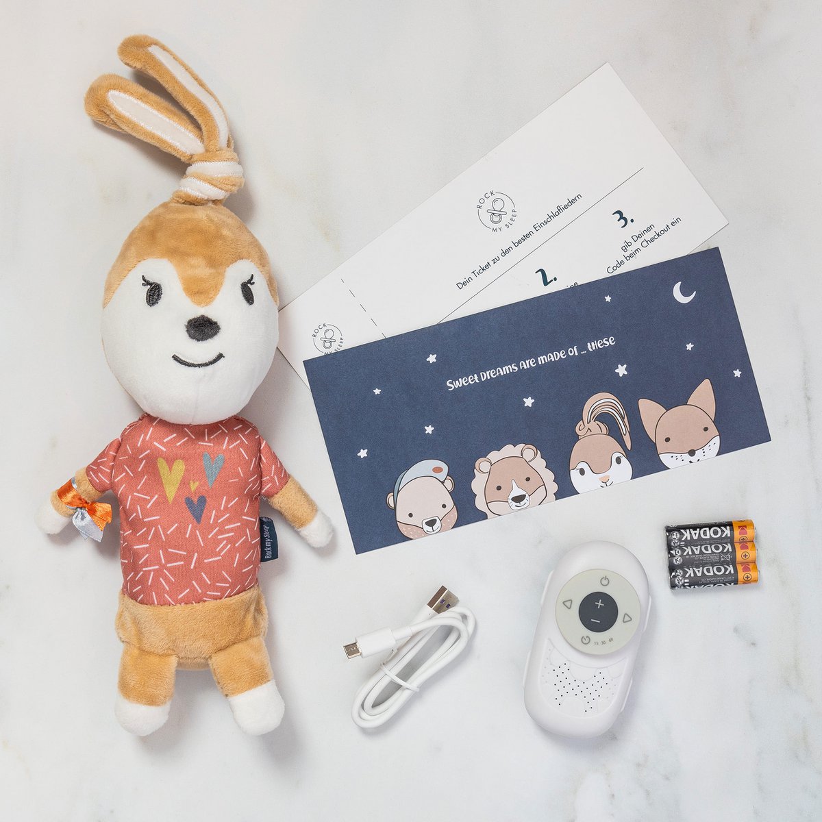 No more Twinkle, Twinkle, Little Star! Rock my Sleep music boxes play full versions of all your favourite songs at the touch of a button. Choose from a variety of cover versions of rock, pop and hip-hop hits and save them on the built-in, removable music player. Tracks can be downloaded from the Rock my Sleep music store and easily transferred to the music box using the enclosed data cable. In addition to the songs offered by Rock my Sleep, you can also upload your own music or audio books – for a customised music box and personalised bedtime ritual for the whole family.