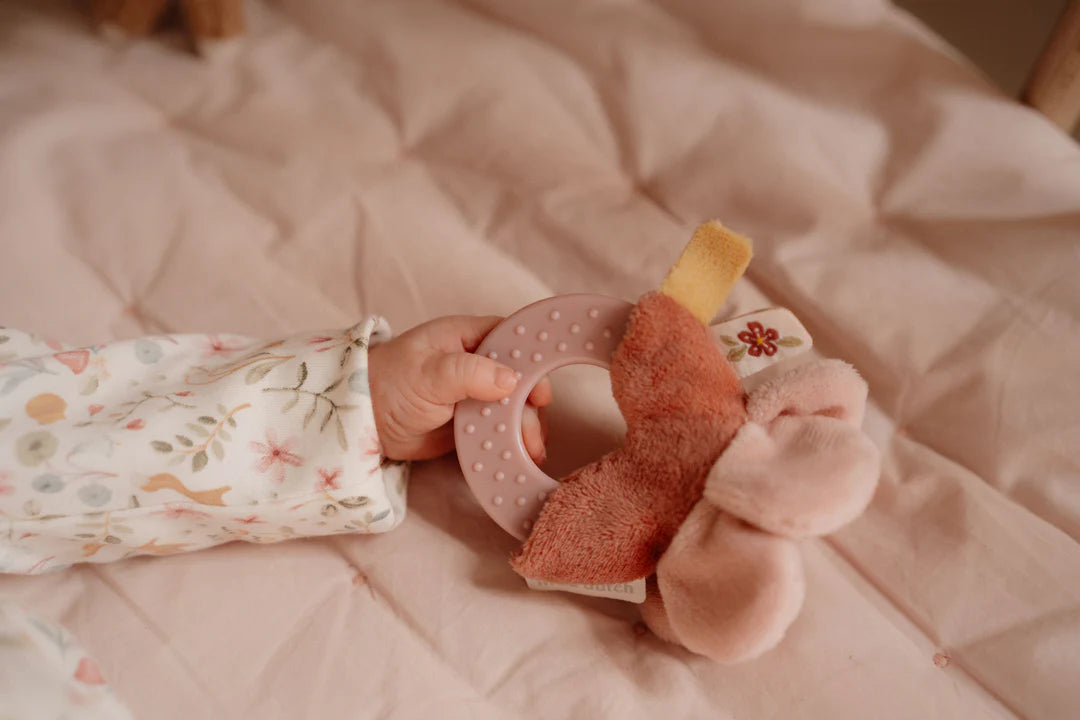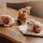 Our favourites from the Fairy Garden collection make a perfect baby gift or baby shower present. This beautiful box contains three soft products for sleeping, cuddling, and playing. The soft muslin cuddle cloth with a soft little bird is perfect for snuggling, but also great for a game of peek-a-boo. The cuddly deer is always up for a big hug and play-pretend adventures. This set also includes a teething ring to give comfort when your first teeth start to emerge. And the cute flower on the ring stimulates hand-eye coordination and curiosity in babies. All three products are packed in one beautiful gift box.