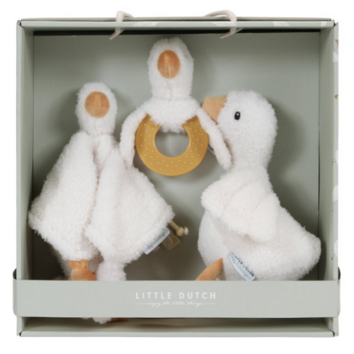 Meet Little Goose, your baby’s new best friend. A perfect gift for a new born or baby shower. This lovely box includes a selection of our favourite soft items from the Little Goose collection, to snuggle, hug and play. The super soft plush cuddle cloth is wonderful to snuggle with and give comfort during sleepy time. The cuddly Little Goose toy is always in for a hug and will never leave the baby’s sight. To play, this set includes a funny ring rattle that promotes the hand-eye coordination and stimulates baby’s curiosity. But also suitable to chew on when a baby starts teething. All 3 items packed in one beautiful gift box.