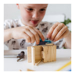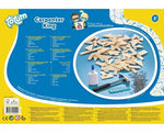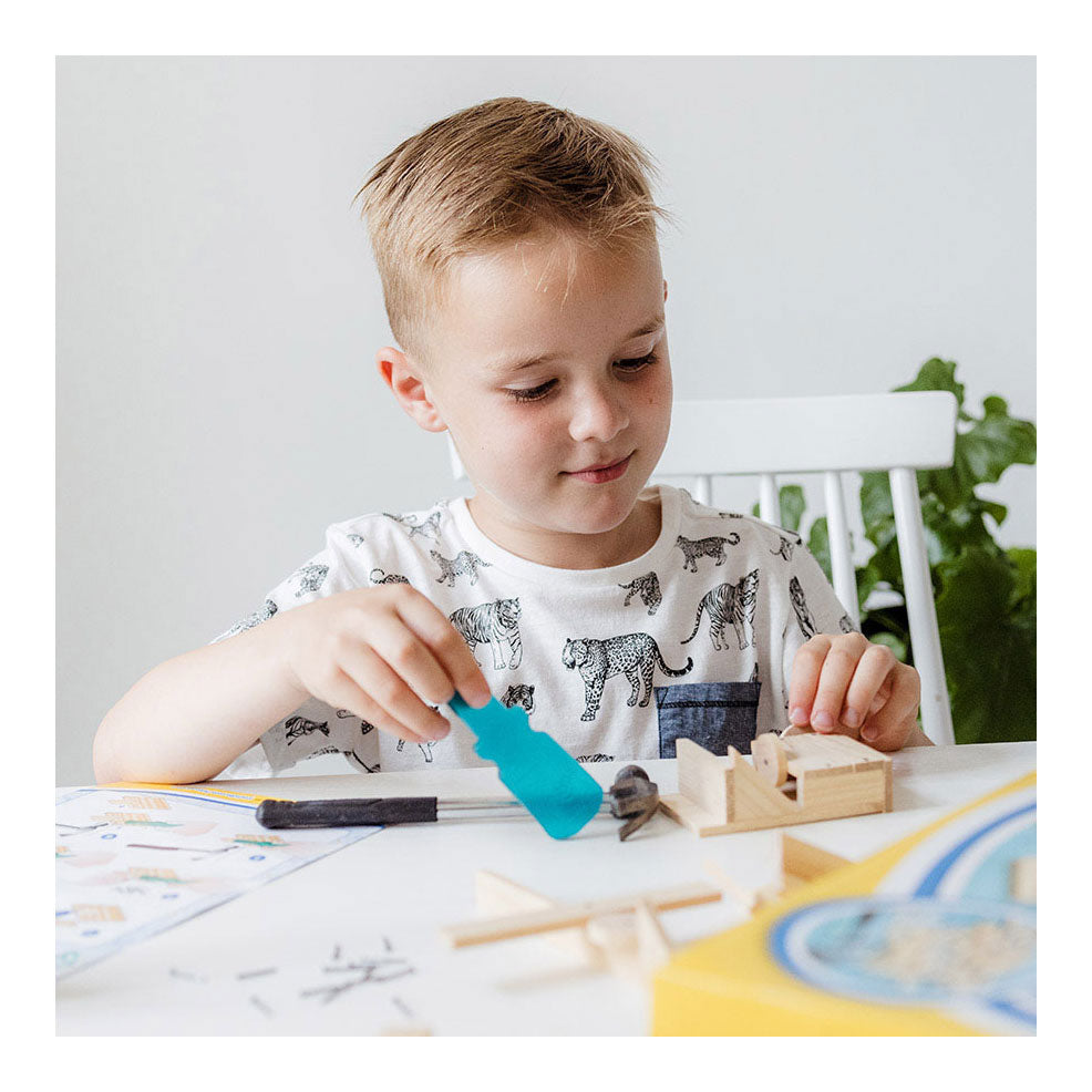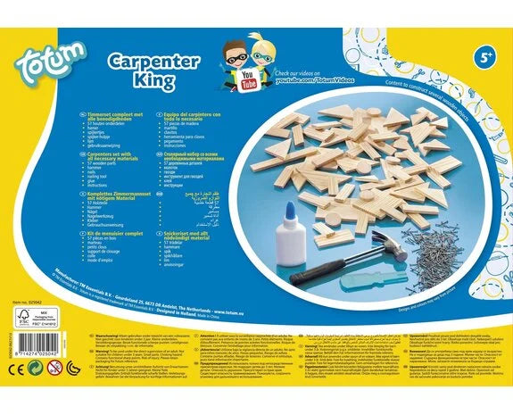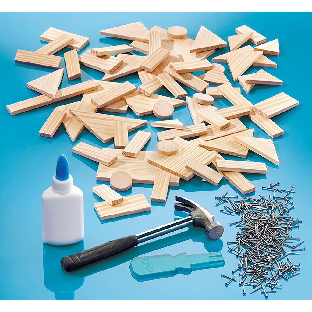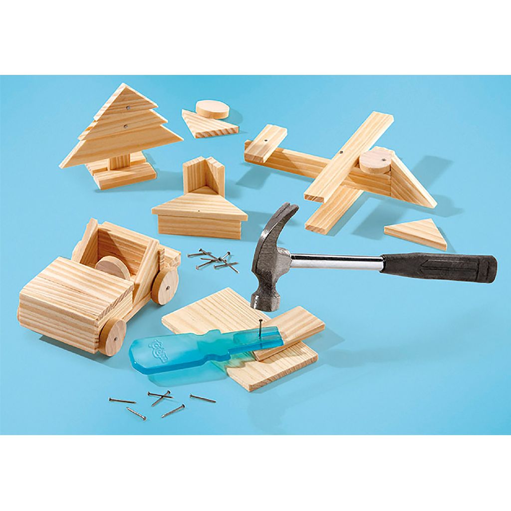 Carpentry set complete with all necessities. Contents: 57 wooden parts, hammer, nails, nail tool, glue and instructions.
