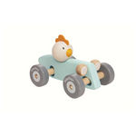 Make a speedy get-away from the chicken coop with this nippy blue car and a hen racing driver. The vintage race car is painted light blue shade and features turning front wheels for tight manoeuvres. Little motoring enthusiasts will love this smart toy and super-cute chicken driver.  Team up with other racing cars by Plan Toys for motoring fun with a friend.