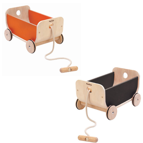 A classic wooden pull along wagon. Children will love to put their favourite toys inside and pull them about the house and garden with this beautiful toy wooden cart. Sturdy wheels with rubber grips ensure a steady ride. The simple way the rope attaches through a hole at the front allows you to add more wagons or wheeled toys to make a train. Beautifully crafted eco wooden toys from Plan Toys.