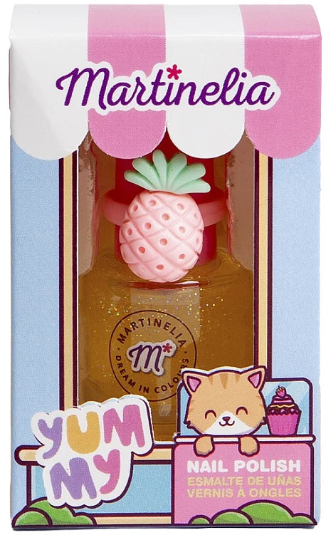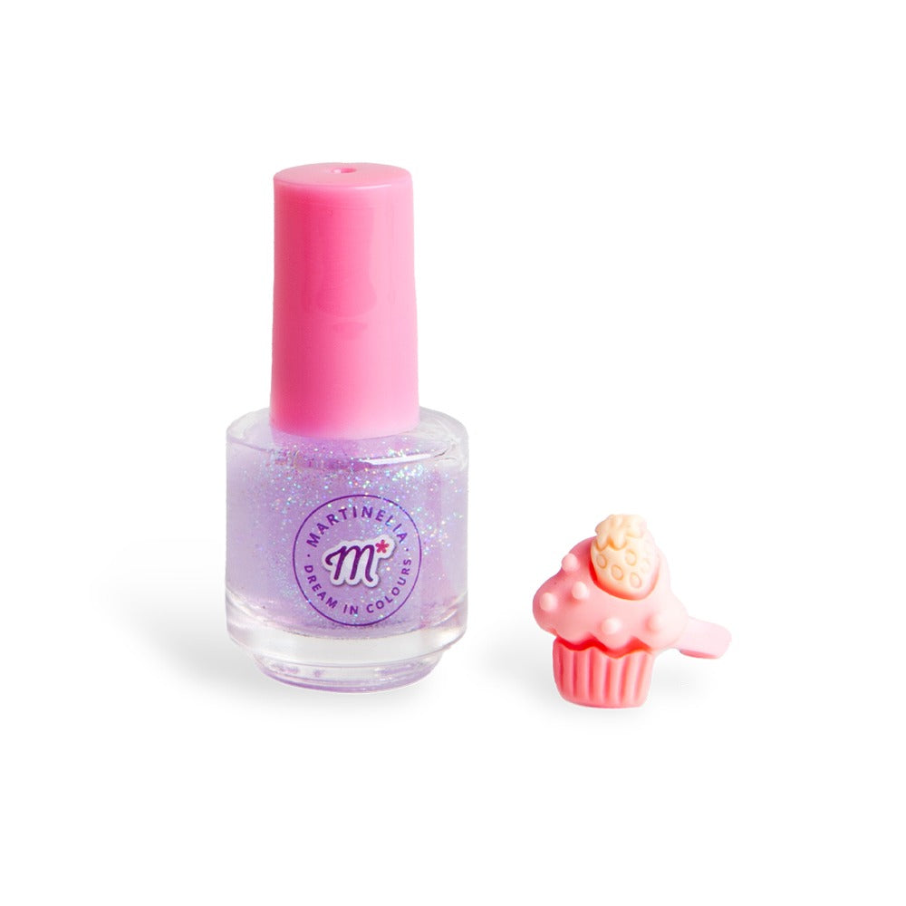 Martinelia Yummy series presents a Super Nail Polish Set accompanied by a playful ring adorned with delicious decorations. The set includes a 5ml bottle of transparent nail polish, available in pink, purple, or orange, featuring glitter for added sparkle. Additionally, it comes with a charming ring designed to bring fun to your style and mood. Specifically crafted for children, Martinelia products are free of harmful chemicals and parabens, offering easy removal with warm water.