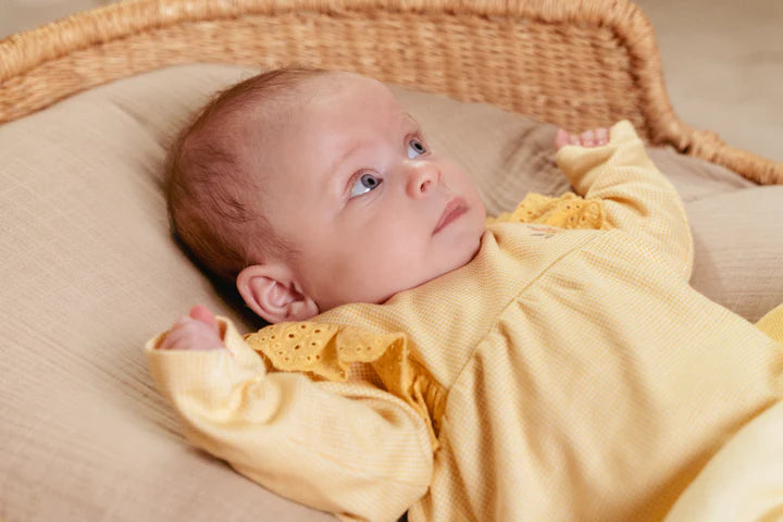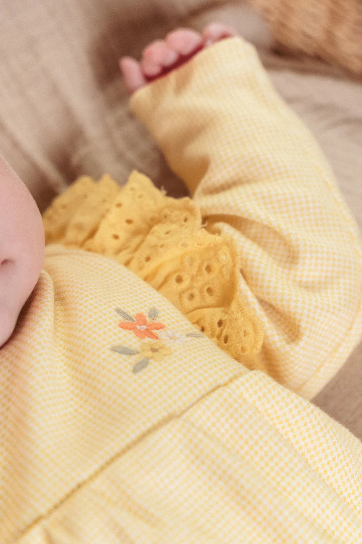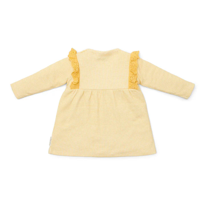 Happy checks! The warm yellow checkered all-over print of this sweet dress will brighten up any day with a sunny look. The adorable design features cute ruffles on the shoulders with delicate broderie anglaise details that add a playful yet elegant accent. Made from organic cotton, this dress offers your little one both comfort and style. Combine it effortlessly with other pieces from the matching Little Farm collection.