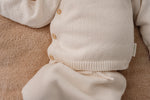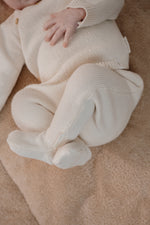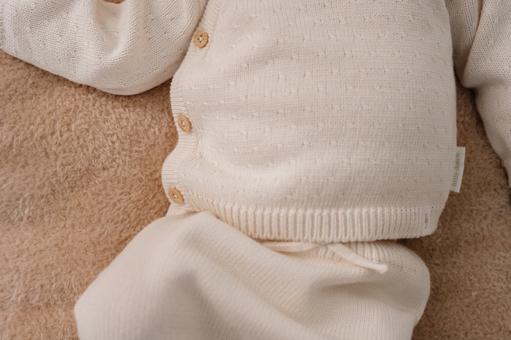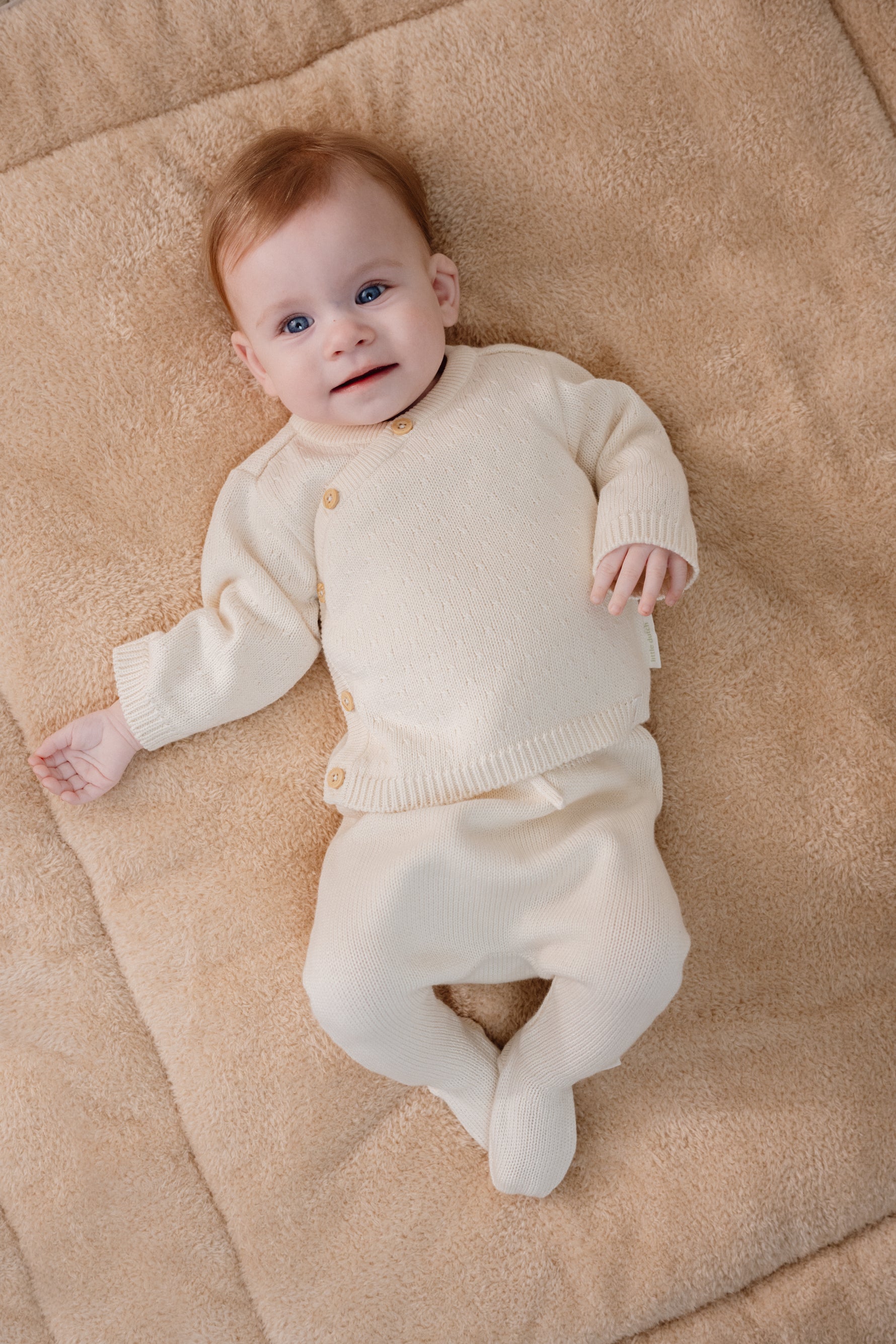 These wonderfully soft trousers with feet in knitted Off White are a must-have for cold days. No more fussing with socks that keep coming off - the footed trousers keep those little toes nice and warm. The subtle bow detail adds a touch of cuteness, while the soft, warm quality ensures optimal comfort. Made from organic cotton and Oekotex-certified, so perfect for baby's sensitive skin and the planet. Pair it with the matching cardigan and accessories for a complete, cosy outfit. Available in sizes 44 to 74.