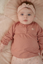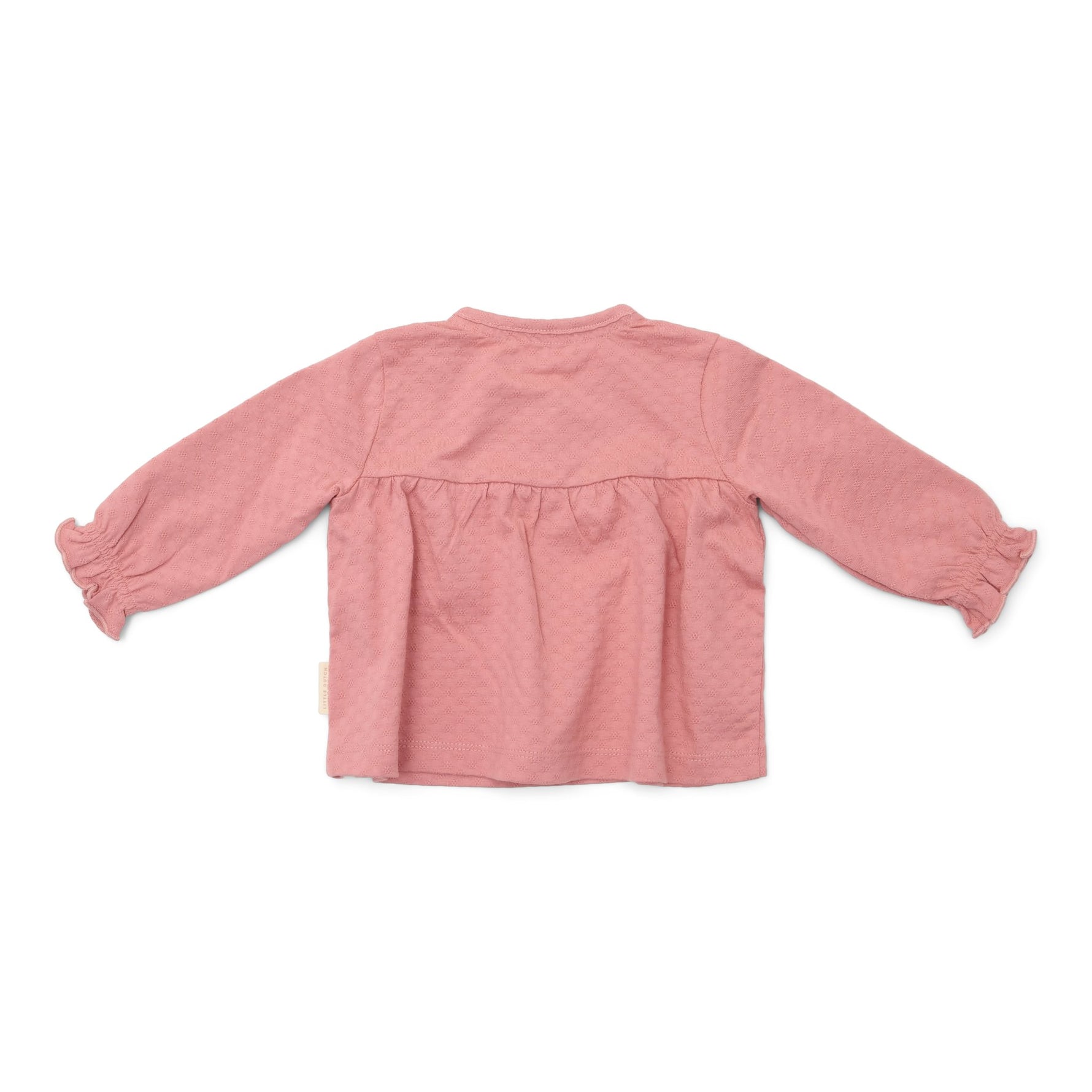 Shine in Pink Blush! This cute long-sleeved t-shirt, made of organic cotton with a fine texture, ensures all-day comfort for your little one. The elastic ends of the sleeves are equipped with charming ruffles, which adds a playful touch to the design. Small buttons in the shape of flowers make dressing your baby easy and emphasize the cute look of the shirt. A small embroidered flower gives the front an enchanting accent. Perfect to combine with all items from the coordinated Fairy Garden collection. Available in sizes 44, 50, 56, 62, 68 and 74.