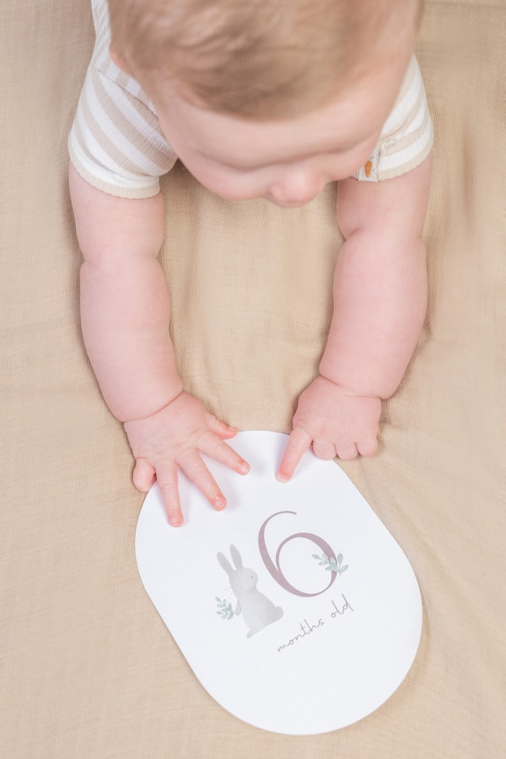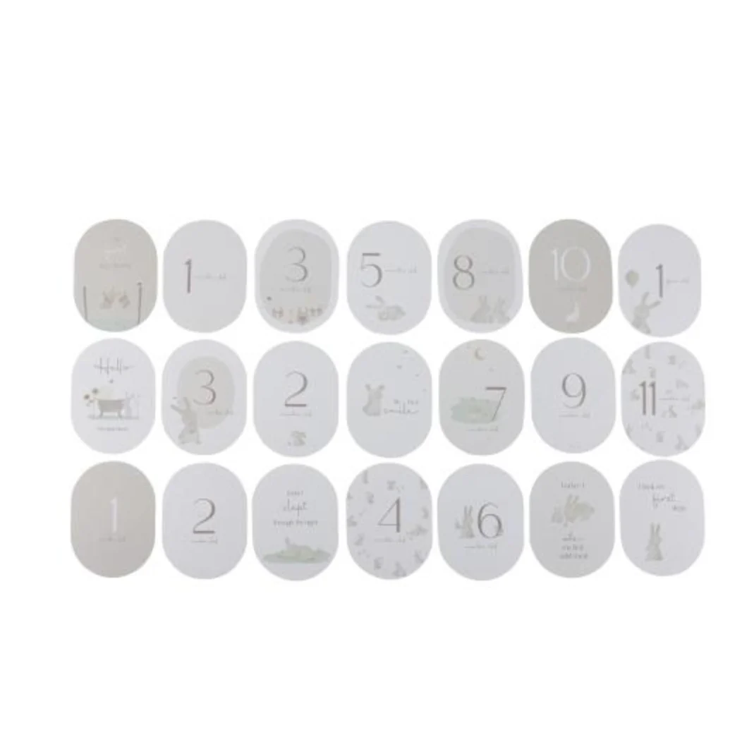 Capture all those precious memories of your newborn baby. Watch your baby grow and achieve unforgettable milestones with this set of 21 uniquely designed cards. From the first smile to the first steps, each card is carefully crafted to mark those special moments in your baby's early days. The milestone cards come housed in an exquisite light beige box adorned with luxurious linen fabric. The box is decorated with the same enchanting Baby Bunny design that graces the milestone cards, along with the heartfelt text, ‘Little moments, big memories’. It's the perfect home for your bundle of joy's unforgettable moments, creating a treasure trove of memories that will be cherished for a lifetime. Every moment is precious, every milestone is unique. Enjoy this special journey with your little bunny!