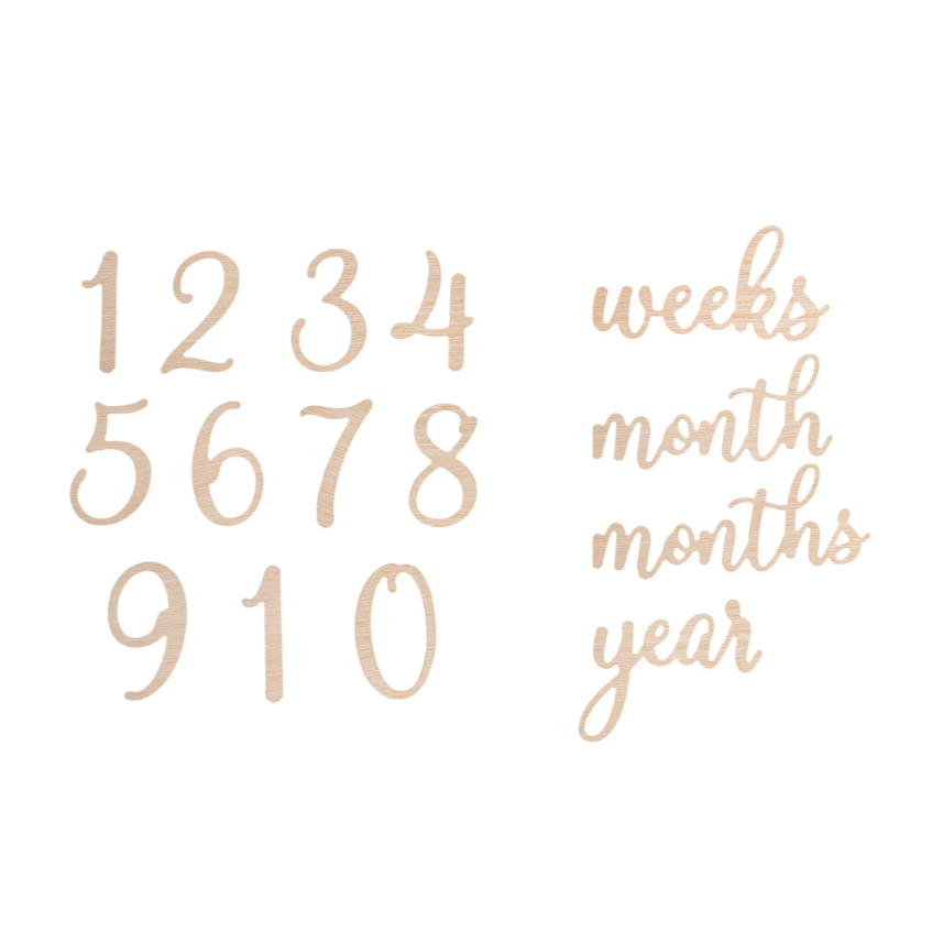• Includes numbers 0-9 (with two 1’s) and growth milestone words “weeks,” “month,” “months” and “year” to document baby’s growth through your entire pregnancy and their first year and beyond