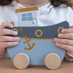 Let’s sail away and explore the sea! Pull the rope and this little boat will follow you around to discover every corner of the room. Made from durable wood this pull-along toy will ensure endless fun and play. This wooden boat on wheels will encourage your little one to walk and will help develop your child’s motor skills.