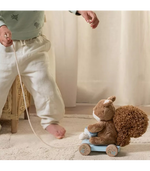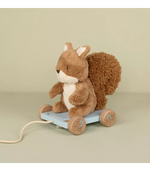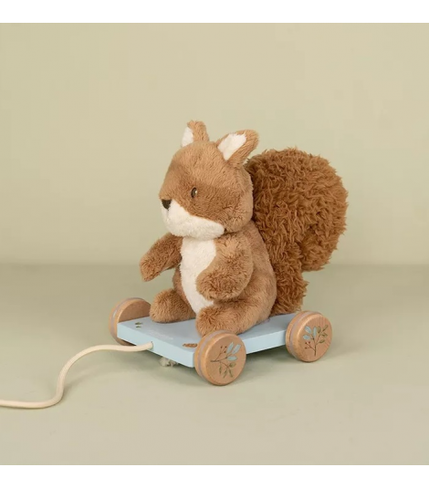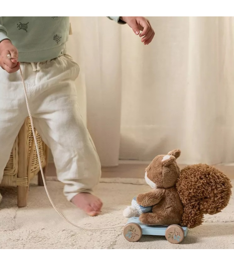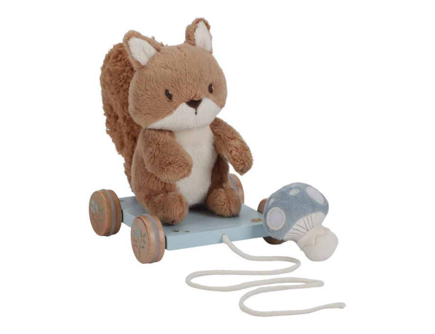 Bring the squirrel along! Pull the rope and embark on an adventure together. The squirrel will follow you through the enchanted forest of Forest Friends, where friendly animals play with leaves, acorns, pinecones, and mushrooms amongst the tallest trees. The soft and cuddly squirrel of this pull-along toy stands on a blue wooden carriage decorated with leaves. With the little string, your little one can guide him through the house and play. It's an adorable toy that encourages walking and helps develop motor skills.