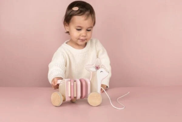 This little deer is ready for an adventure! Simply pull the string and watch as the deer gracefully follows along, whether you're exploring the living room, navigating through hallways, or walking circles in your room. Go on enchanting journeys to the mystical Fairy Garden, where you and your deer friend will discover breathtaking flowers and magical wonders. Crafted from sturdy wood and adorned with colourful rings, this pull-along deer not only provides endless entertainment but also promotes walking and enhances motor skill development