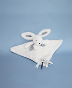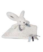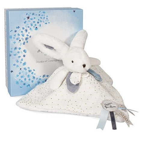 The "Happy Glossy" blue rabbit flat comforter with box is an adorable gift for toddlers! Soft and colorful, this little rabbit will quickly become his favorite companion. Stylish, “mix and match” trend, with its silky white pompom, trimmed with touches of white, gold and sky swaddle, as well as fancy trimmings and skilfully coordinated woven ribbons, this happy rabbit sparkles with freshness. Snuggled up in a superb gift box with graphics evoking both modernity and luxury, as if in a magical setting, this surprise cuddly toy is delicately revealed.