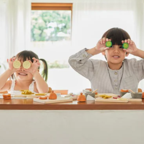 Everyone loves a charcuterie board! With this set, children can prepare a European-style appetizer that’s guaranteed to impress their guests. This set includes 2 pickled cucumbers, 2 strawberries, 2 crackers, 1 block of brie cheese, 2 slices of gouda cheese, 1 sliceable roll of salami, 1 knife, 1 sauce cup, 1 spoon, and 1 cutting board. Expand upon the meal with other PlanToys pretend foods and kitchenware.