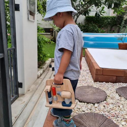 Whether you're building, remodeling or repairing, the Handy Carpenter Set has every tool you'll need for your project! Use the hand drill for installations, the hand saw for shaping wood, the claw hammer for setting materials into place, and other tools like the chisel and ruler to complete the job at hand. A handy wooden stand keeps all your tools in one place for easy access and portable use.