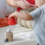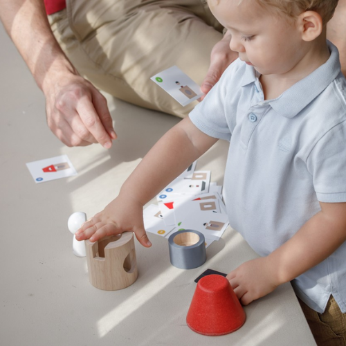 This colorful spaceship helps children understand how objects and people move in relation to one another. Using basic geo shapes and a small deck of index cards, little ones can develop their ability to describe their surroundings, enhance their language and communication skills, and improve hand-eye coordination through play. This set consists of 4 geo shapes, 1 astronaut and 20 index cards with a range of challenges. Find 40 additional designs available for download online! Find 40 additional playing cards available for download. Click “Download Play Instruction" button below!