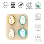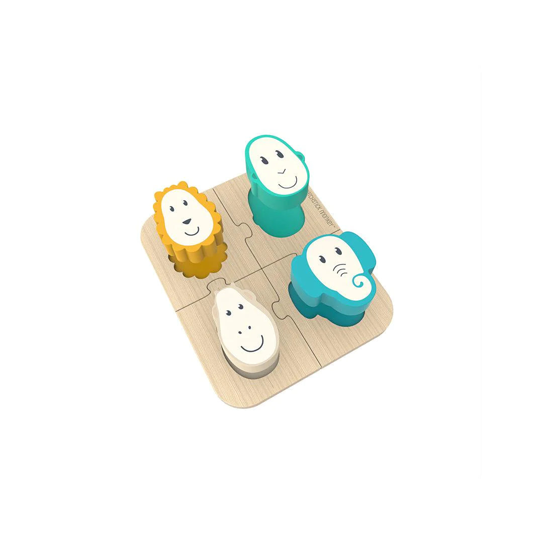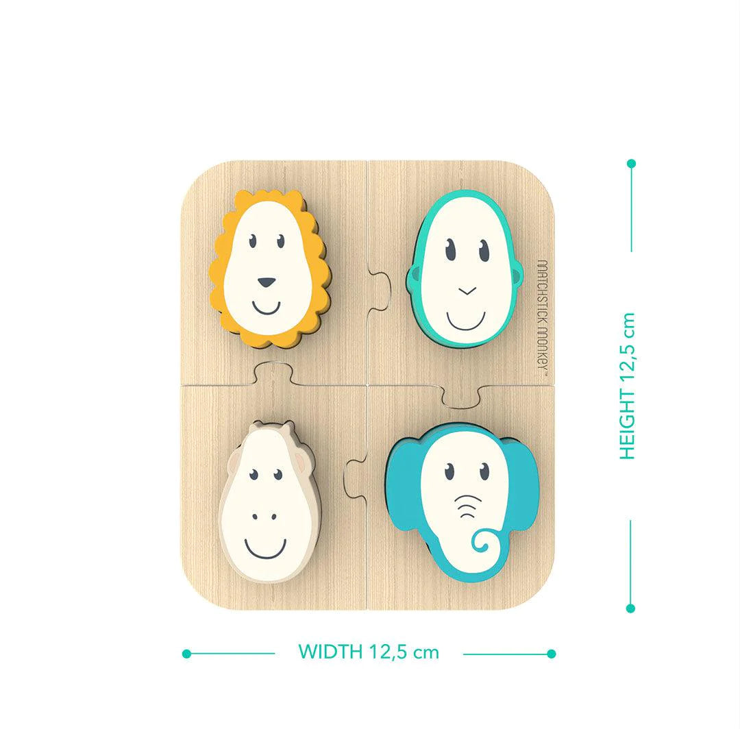 • First match the 4 puzzle shaped pieces to make a base, then match the animal faces to the coloured slot